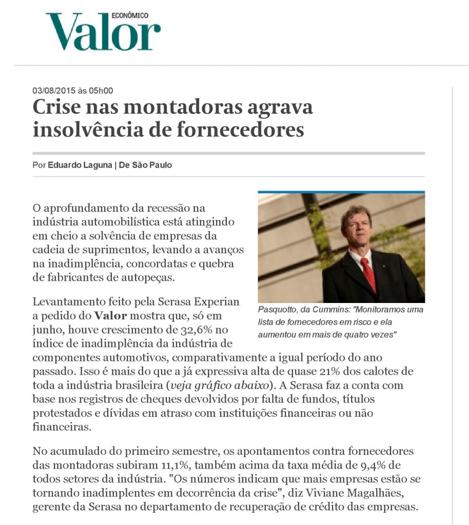 Em entrevista para o jornal Valor Econômico, Fernando Zilveti fala sobre os efeitos da recessão na indústria automobilística e as consequências da crise nesse segmento. O especialista e sócio do Zilveti Advogados, escritório especializado em direito empresarial, diz ver crescer a demanda por consultoria para reestruturação de fornecedores de peças, por exemplo. 04-08-crise-nas-montadoras-agrava-insolvncia-de-fornecedores-valor-economico
