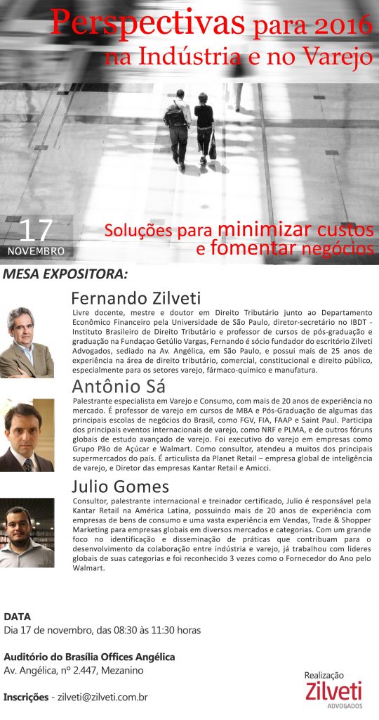 O último evento do ano realizado pelo Zilveti Advogados no dia 17 de Novembro, das 08:30 às 11:30, abordou soluções para minimizar custos e fomentar negócios no Varejo e na Indústria nesse momento de instabilidade política e econômica. O evento foi aberto ao público e gratuito. Veja fotos do evento Aqui !