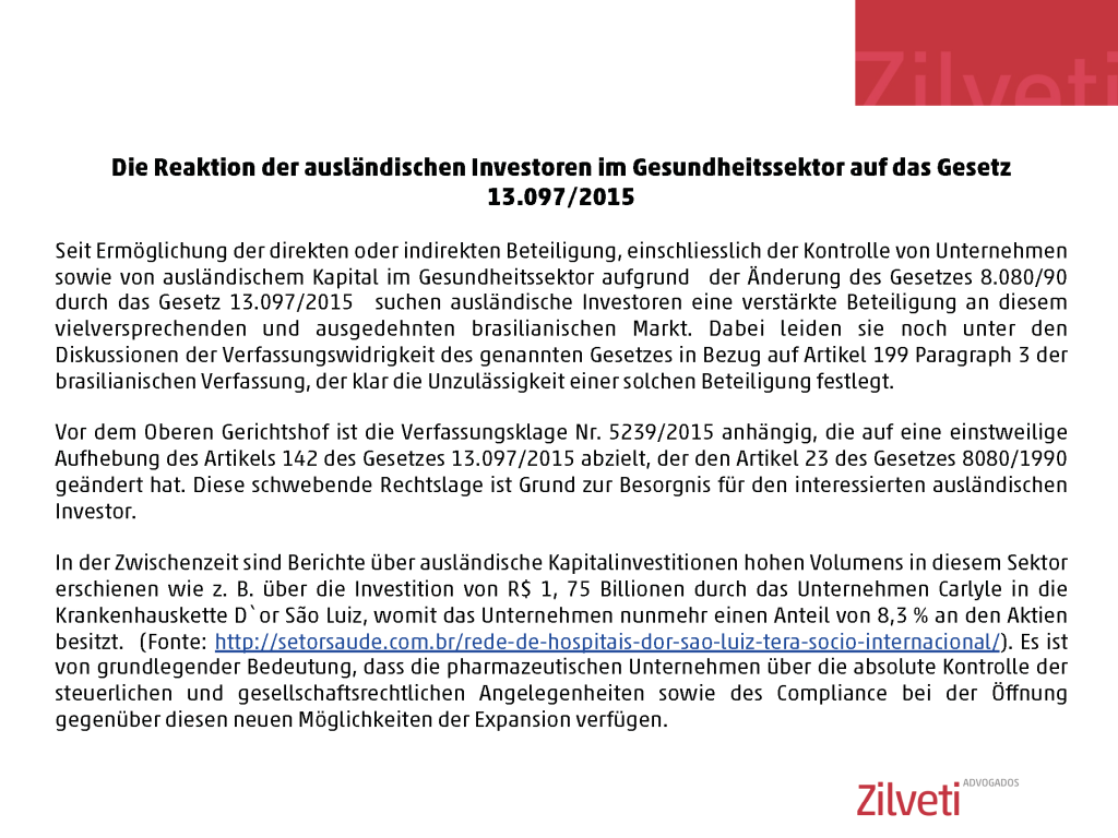 Die Reaktion der ausländischen Investoren im Gesundheitsektor auf das Gesetz 13.097/2015